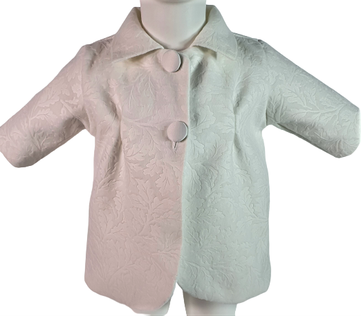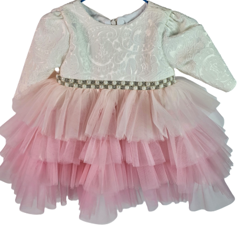 Rochita de botez este realizata din tafta, dantela si tul fin iar la interior este captusita cu bumbac 100%. Paltonul este captusit cu un material moale si calduros. Marimea 62 se preteaza grupei de varsta 0-3 luni.
